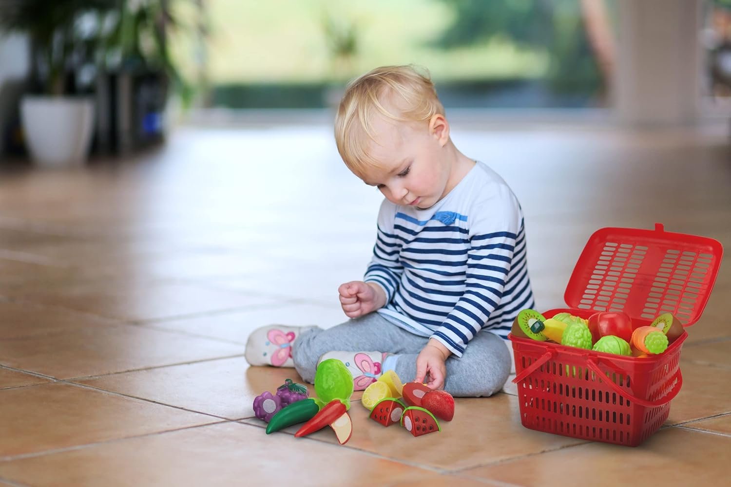 Made from high-quality, durable, non-toxic ABS plastic; Includes 7 fruits, 7 vegetables, a chopping board, a toy knife, and a storage basket