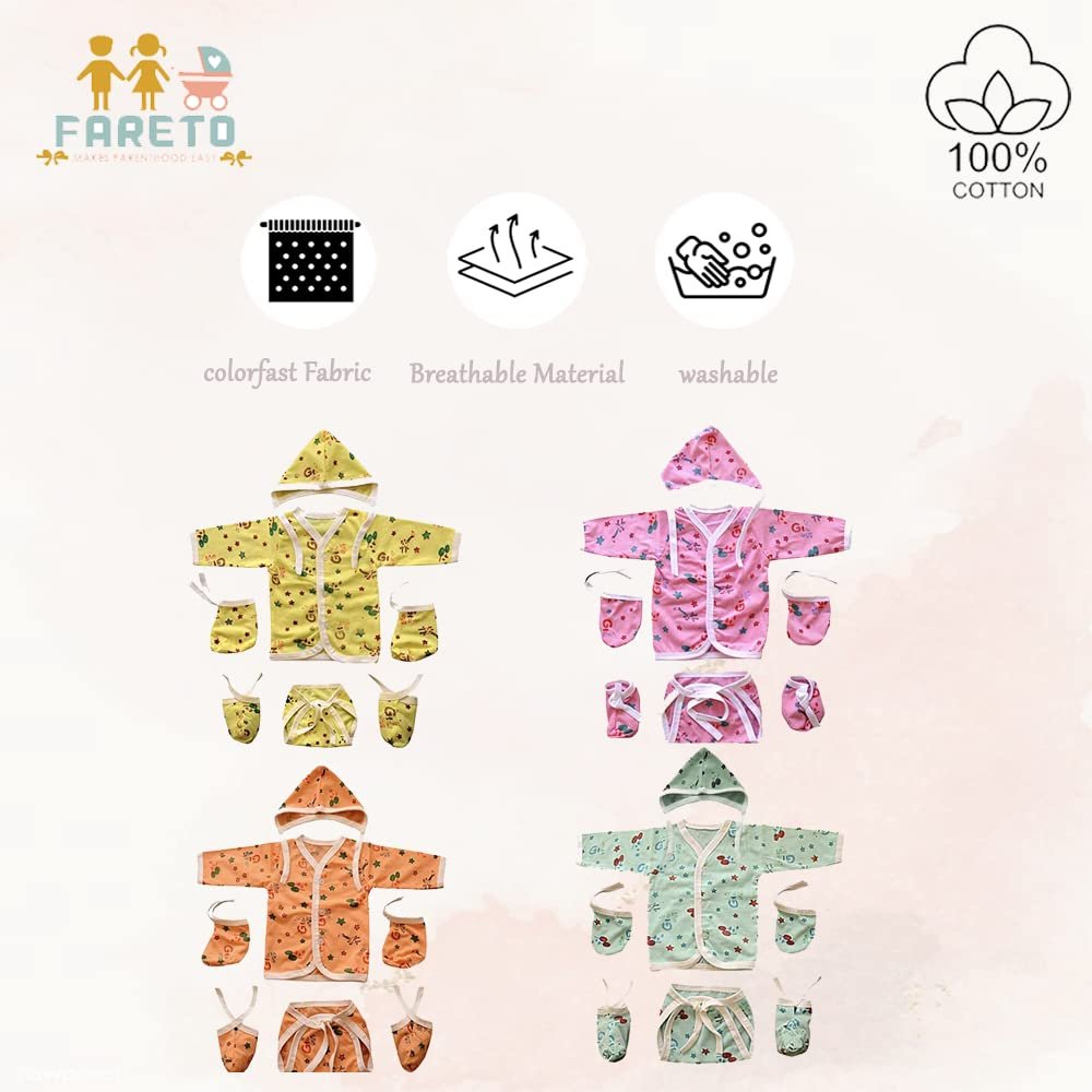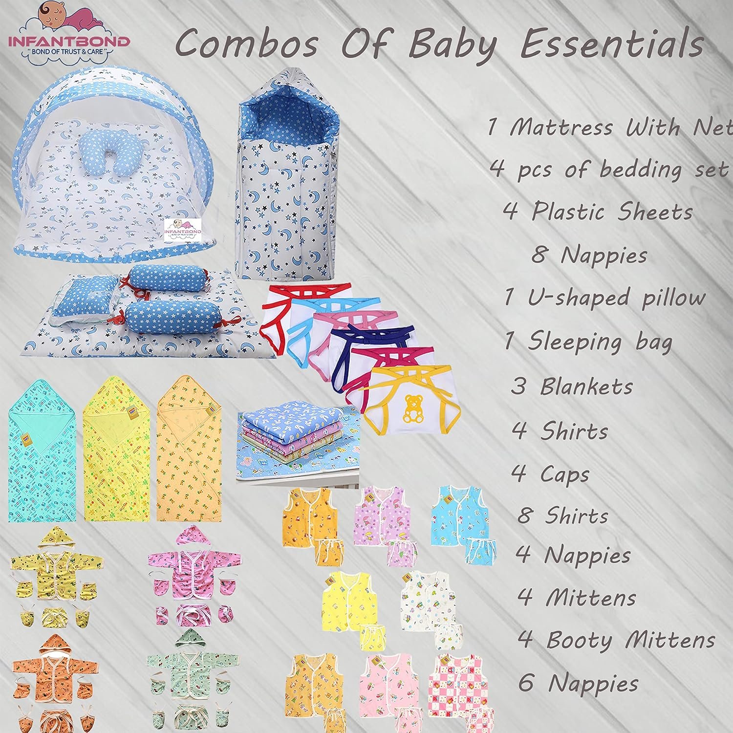 Pack Contains: 4 Front Open Shirt | 4 Nappies | 4 Caps | 4 Pairs Of Mittens | 4 Pairs Of Socks | 4 Waterproof Sheets | 3 Single Layer Wraper | 1 Mattress With Net| 1 U-Shaped Pillow | 1 Carry Bag | 4 Pcs Bedding Set | 8 Front Open Jhabla | 8 Matching Nappies | 6 Hosiery Nappies(Total Items: 56)
